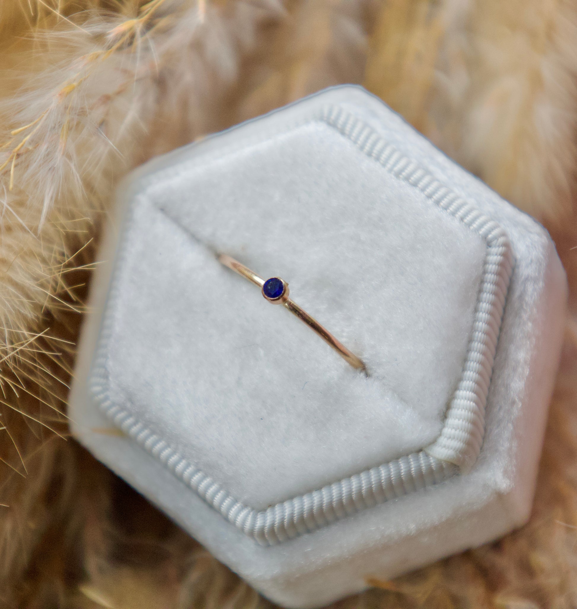 This delicate ring features a 2mm tube set sapphire. Crafted with high-quality 14K gold filled, this ring is designed to last—resistant to tarnishing and perfect for everyday wear and stacking.